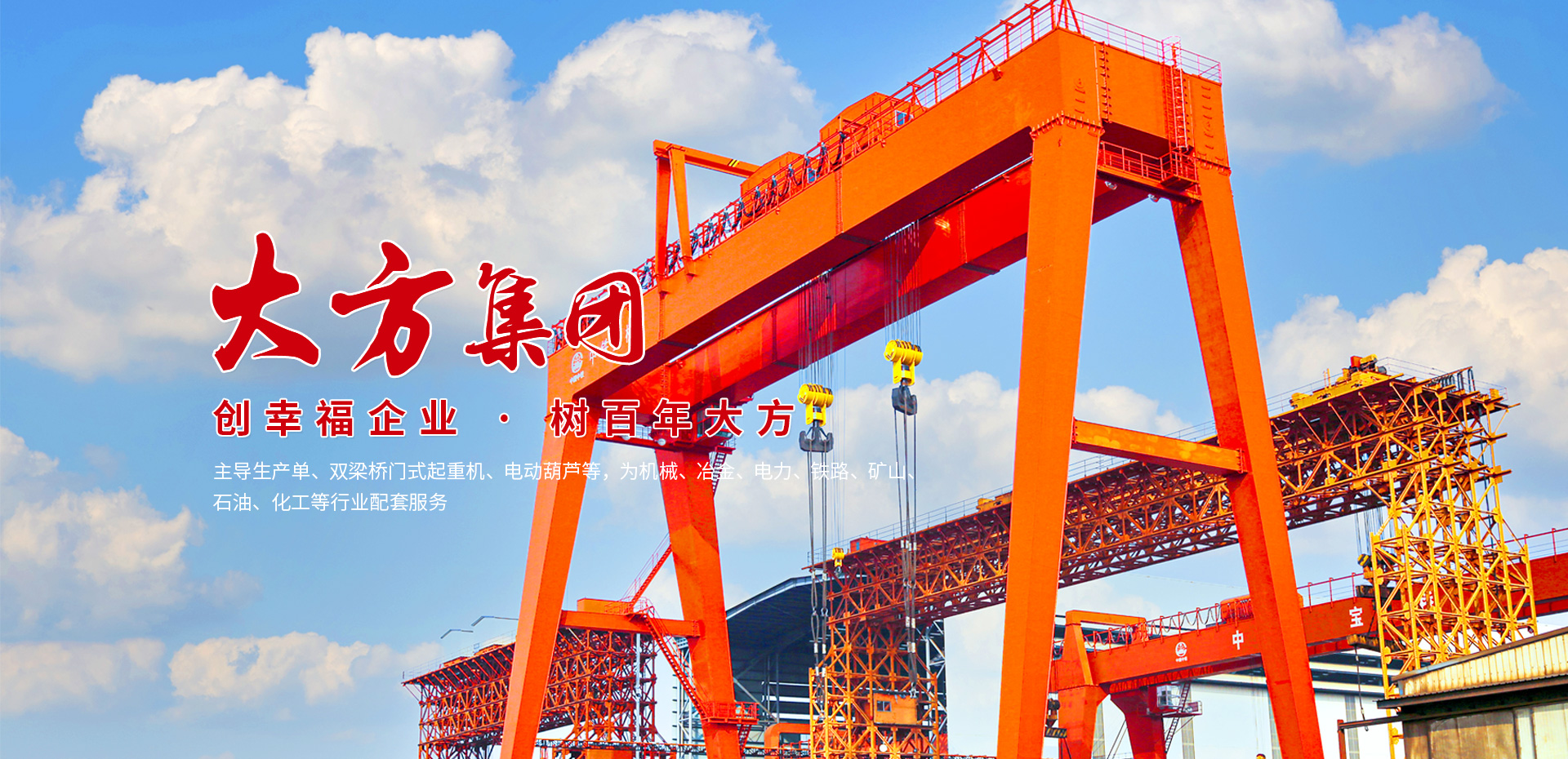 大方集團(tuán)主導(dǎo)生產(chǎn)單、雙梁橋門(mén)式起重機(jī)、電動(dòng)葫蘆等,為機(jī)械、冶金、電力、鐵路、礦山、石油、化工等行業(yè)配套服務(wù),產(chǎn)品出口至美國(guó)、俄羅斯、東南亞等60多個(gè)國(guó)家和地區(qū)
